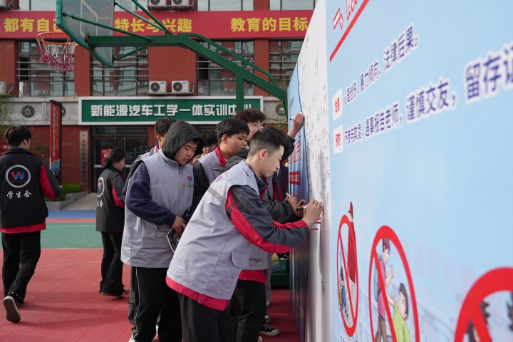 参观结束后,校领导率先在宣传展板上郑重签名,随后各专业师生依次签名承诺,表达以实际行动践行安全理念、共同维护校园平安的决心,亦成为全校上下齐心协力抓安全、保平安的生动见证。